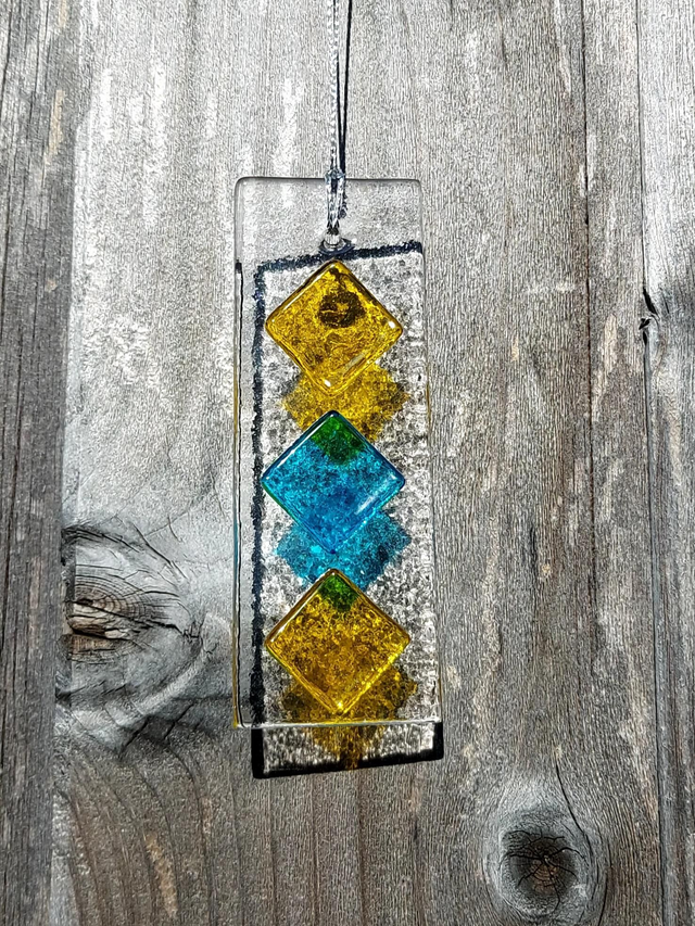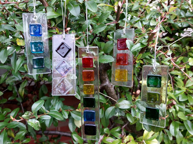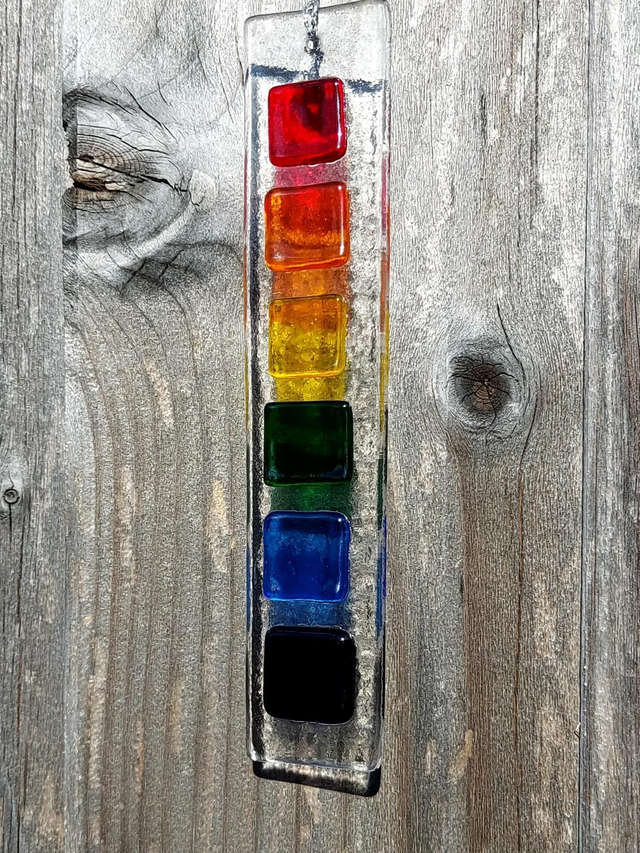 Designed with vibrant fused glass and crafted with love, this multicoloured beauty will add a burst of colour and charm to any space. Hang it by a window and let the sunlight dance through its intricate patterns, creating a whimsical display of colours.