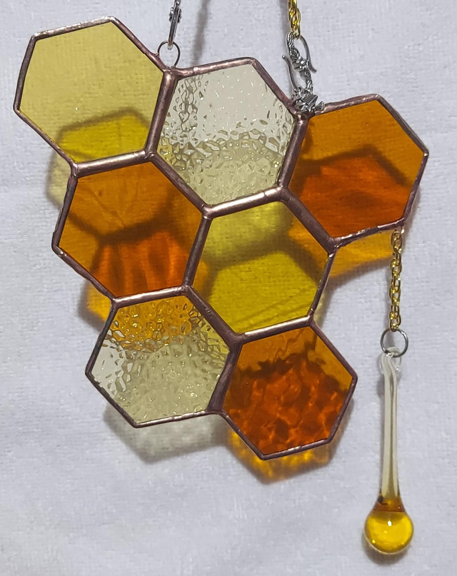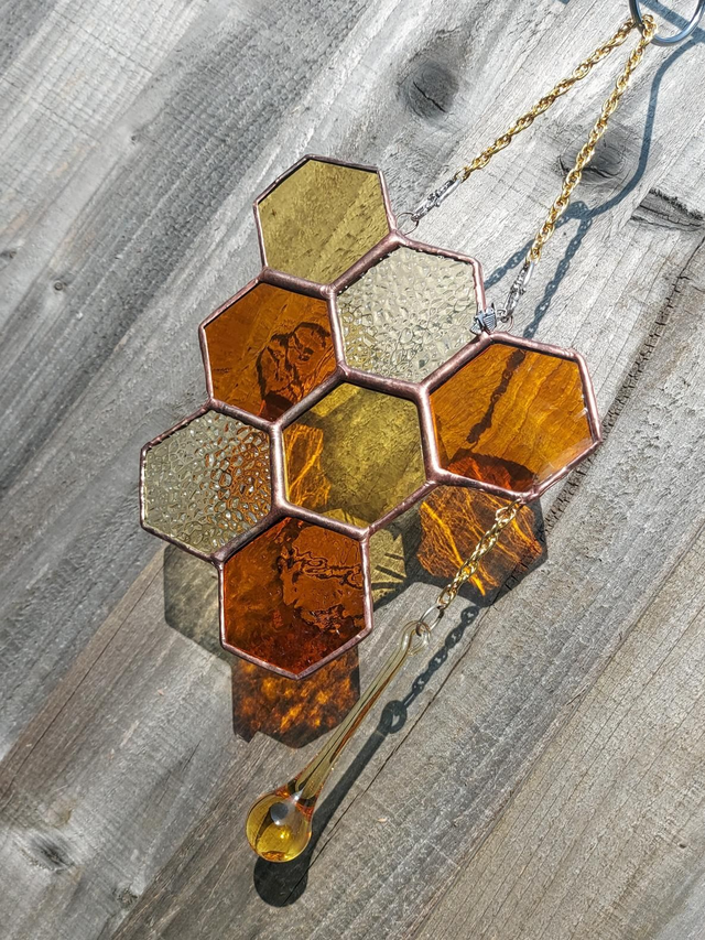 In shades and textures of amber, golden honey drips from precious hexagons.