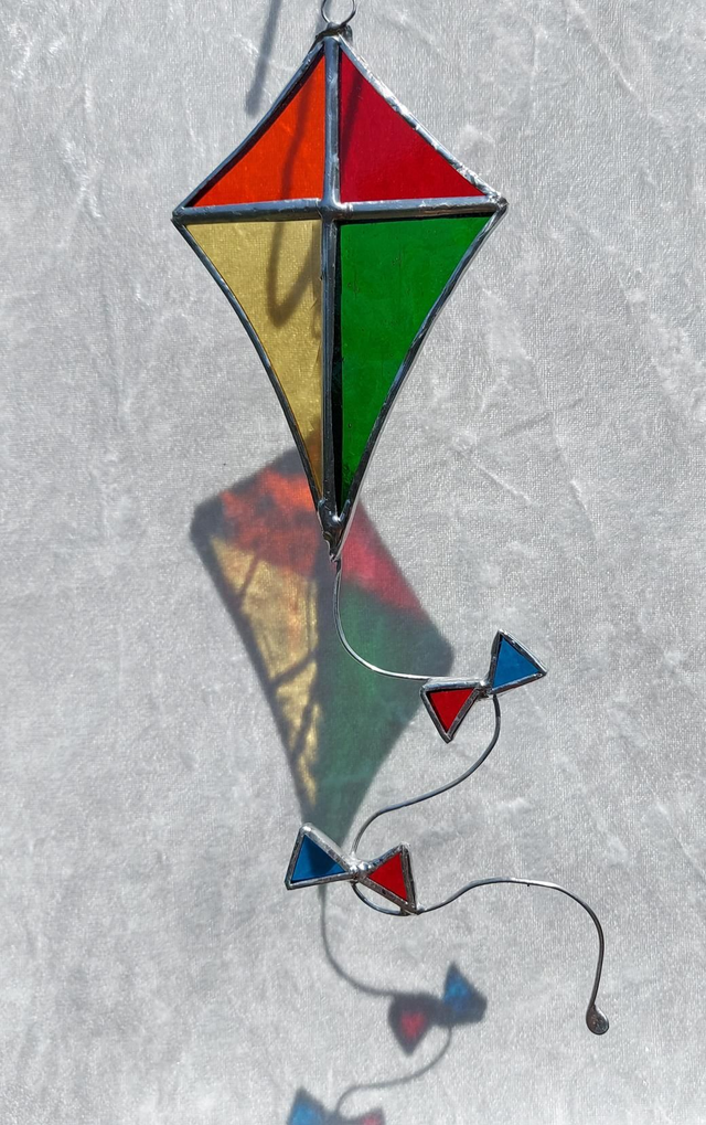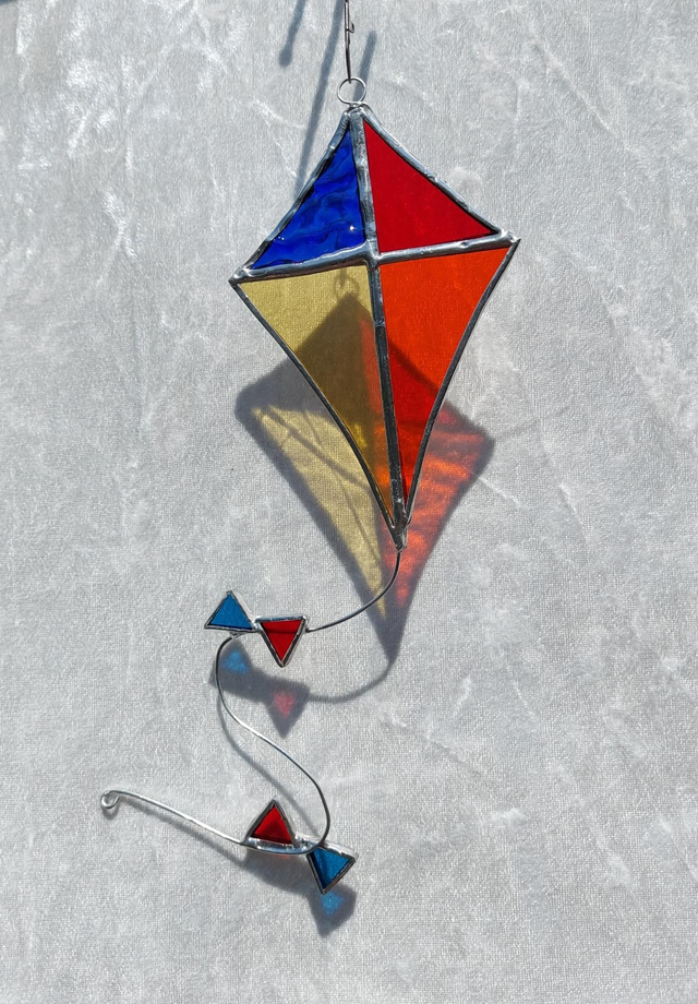 Stained glass kites made using the Tiffany method of copper foil and multi-hued art glass. Finished with a little tail with bows and hanging from a swivel hanger.