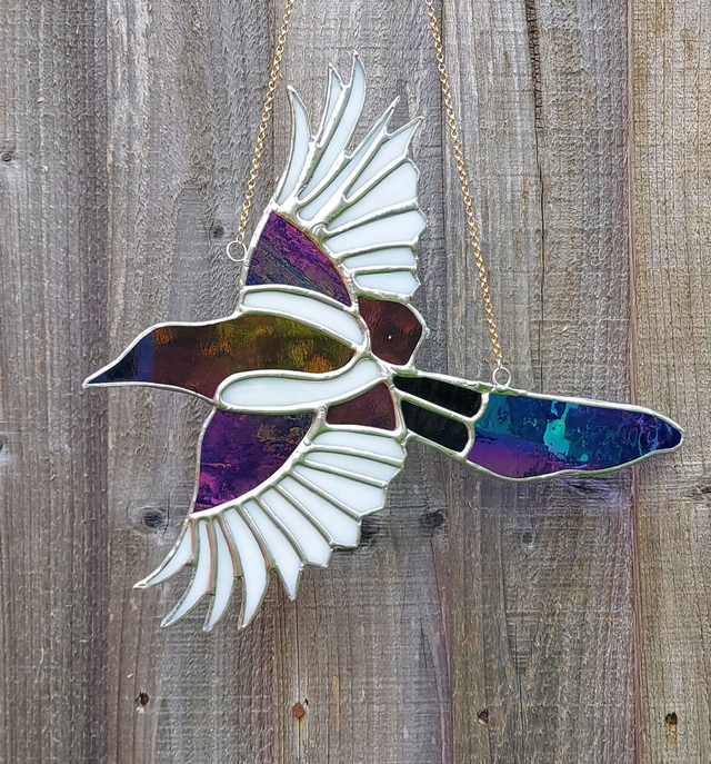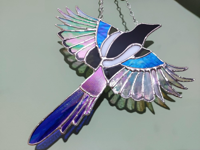 A single magpie in flight, incorporating both blue transparent, and black opal iridescent glass.