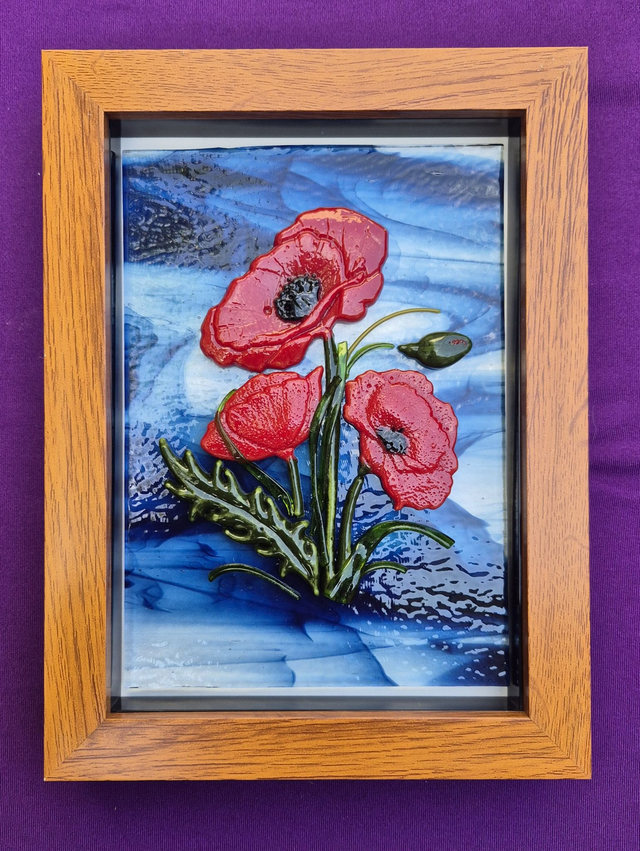 Fused glass poppy and poppy buds on an aventurine blue and clear background, mounted in a 15x20cm freestanding frame with a pale wood effect.