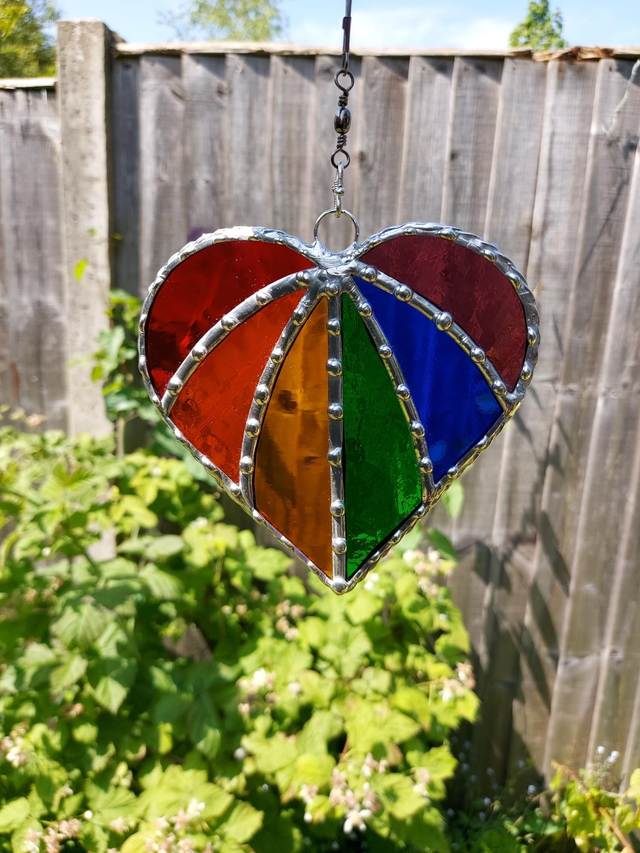 Tiffany method stained glass heart of rainbow colours with heavy decorative soldering